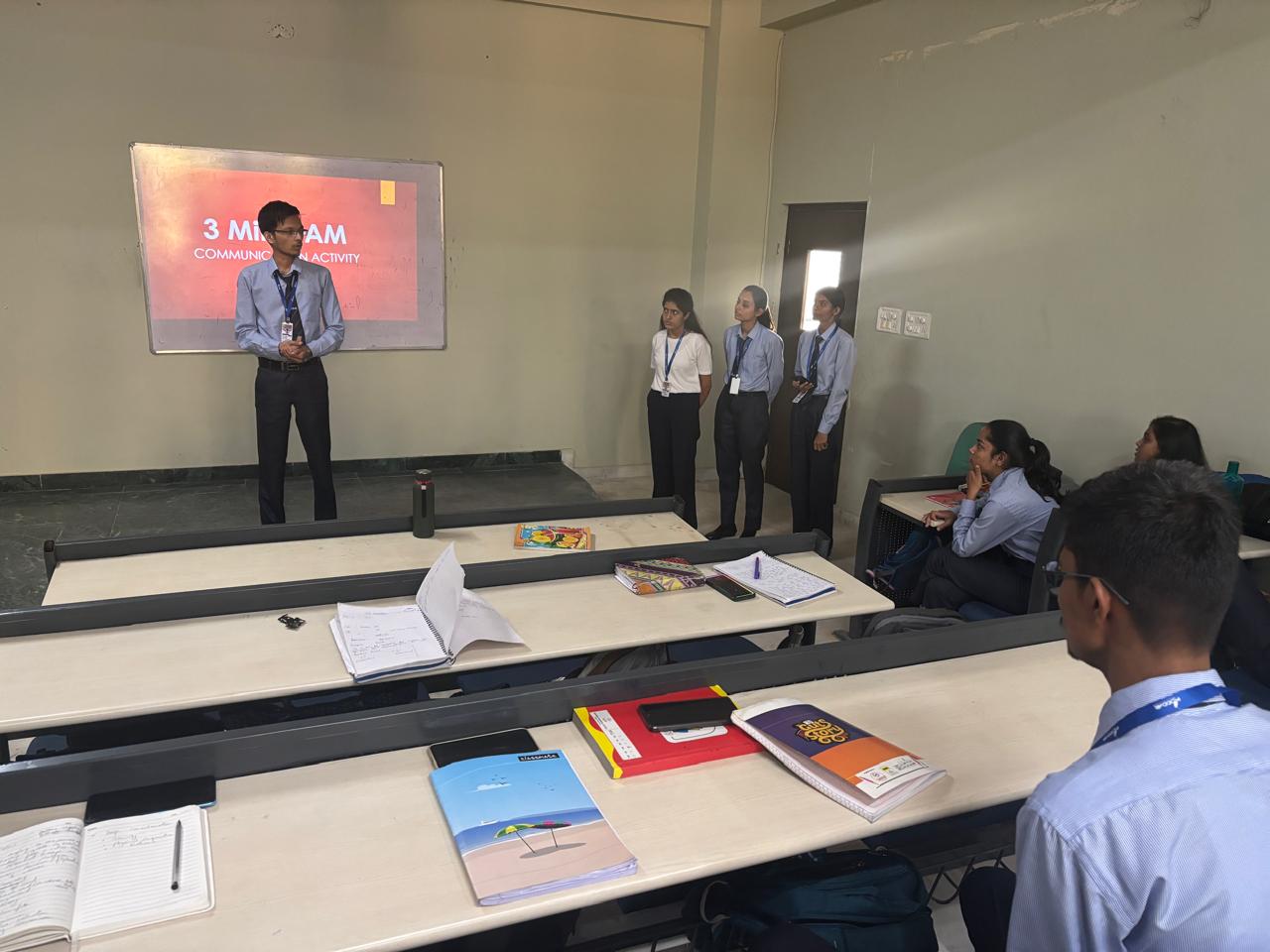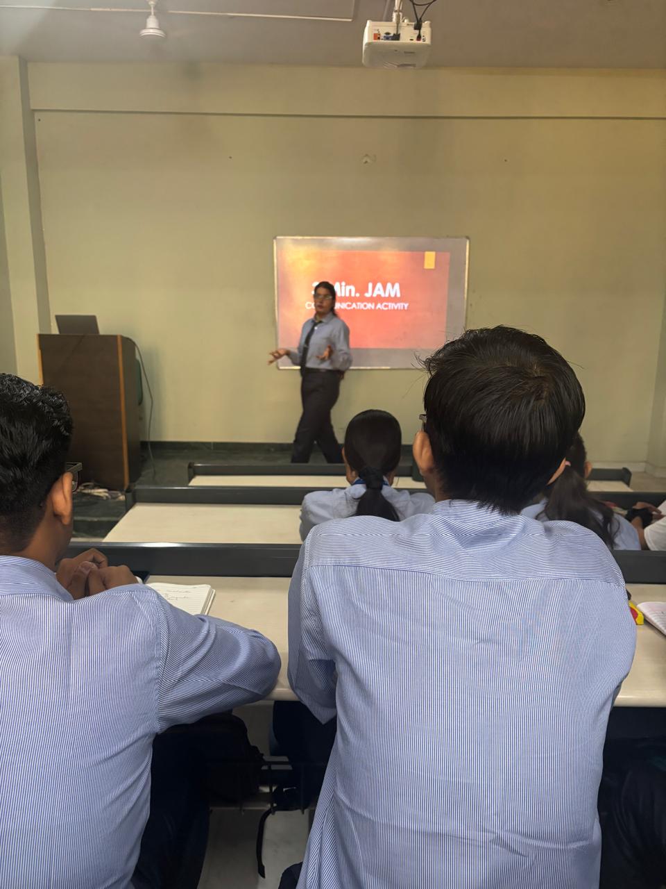 The “3-Minute JAM” (Just A Minute) activity, conducted by Dr. Vaishali Gupta for MBA First-Year students, aimed to build spontaneous speaking, confidence, and clarity of thought among participants. Students were divided into groups of three, and each member was given a topic along with one minute to prepare before speaking confidently for three minutes without hesitation or deviation.