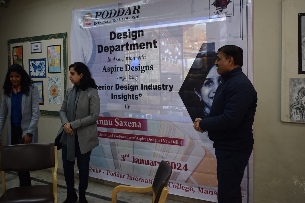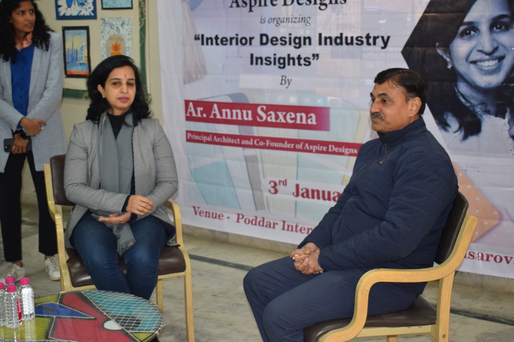 "Interior Design Industry Insights" conducted at Poddar International College. Ar. Annu Saxena, the esteemed Director and Co-founder of Aspire Designs, New Delhi, graciously shared her wealth of experience and knowledge with our interior design students.