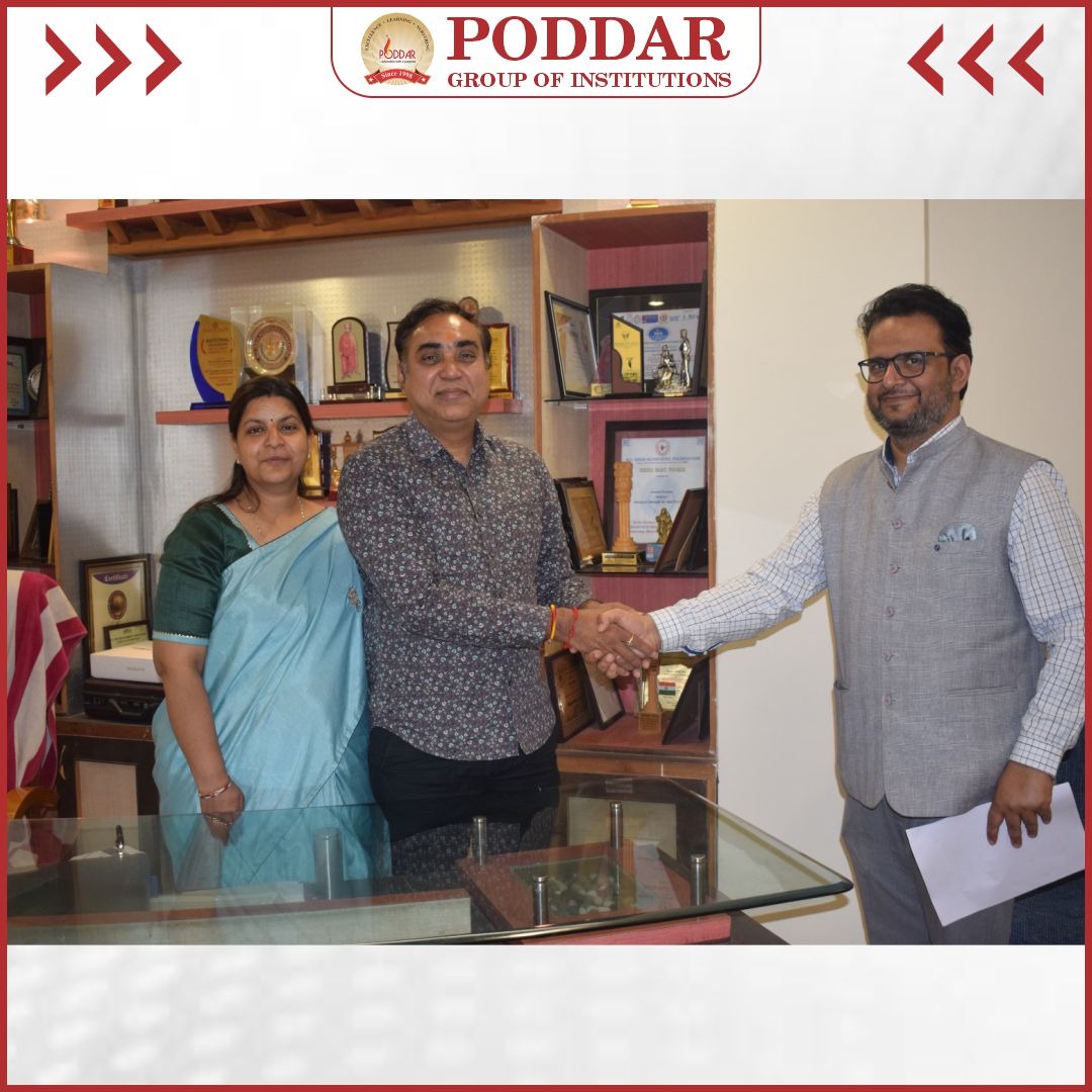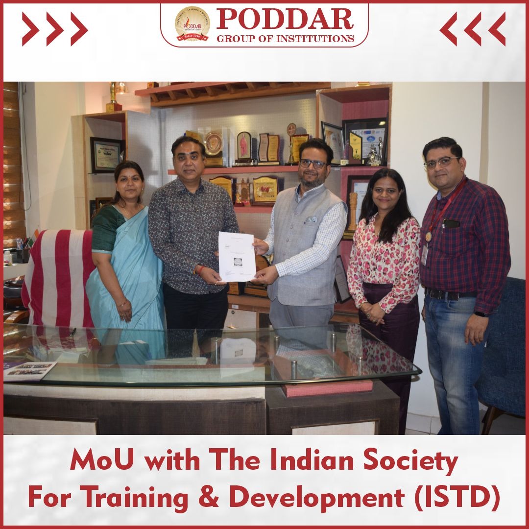 Poddar International College has signed a Memorandum of Understanding (MoU) with the Indian Society for Training and Development (ISTD) Jaipur Chapter. The MoU was signed by Dr. Anand Poddar, Chairman, and Mrs. Roopal Poddar, Vice Chairperson of Poddar International College, with Mr. Mukesh Vyas, Chairman of ISTD.