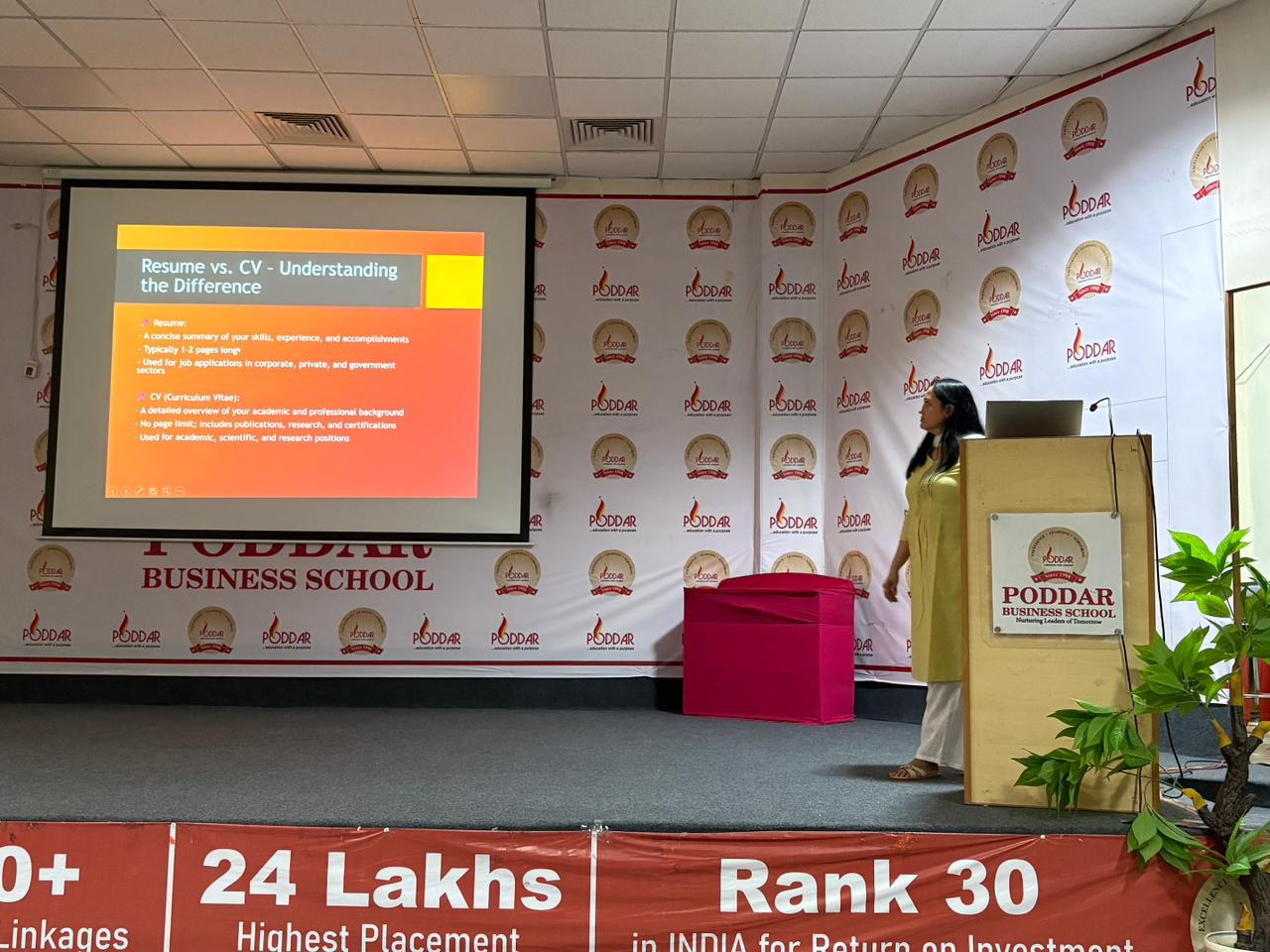 Dr. Gupta guided students through the structure and purpose of a professional resume, differentiating between a Resume, CV, and Bio-data and ATS-friendly designs. Students also learned how to write effective career objectives, avoid common mistakes, and tailor their resumes for different job roles.