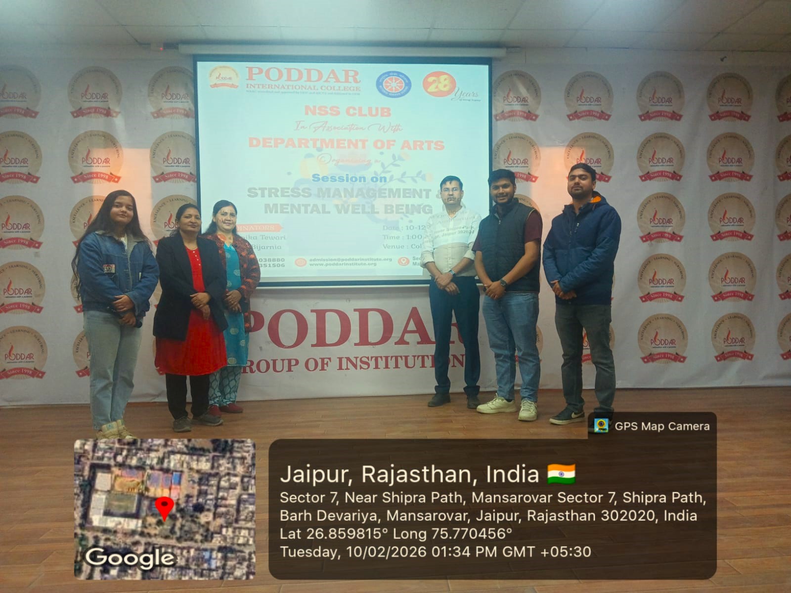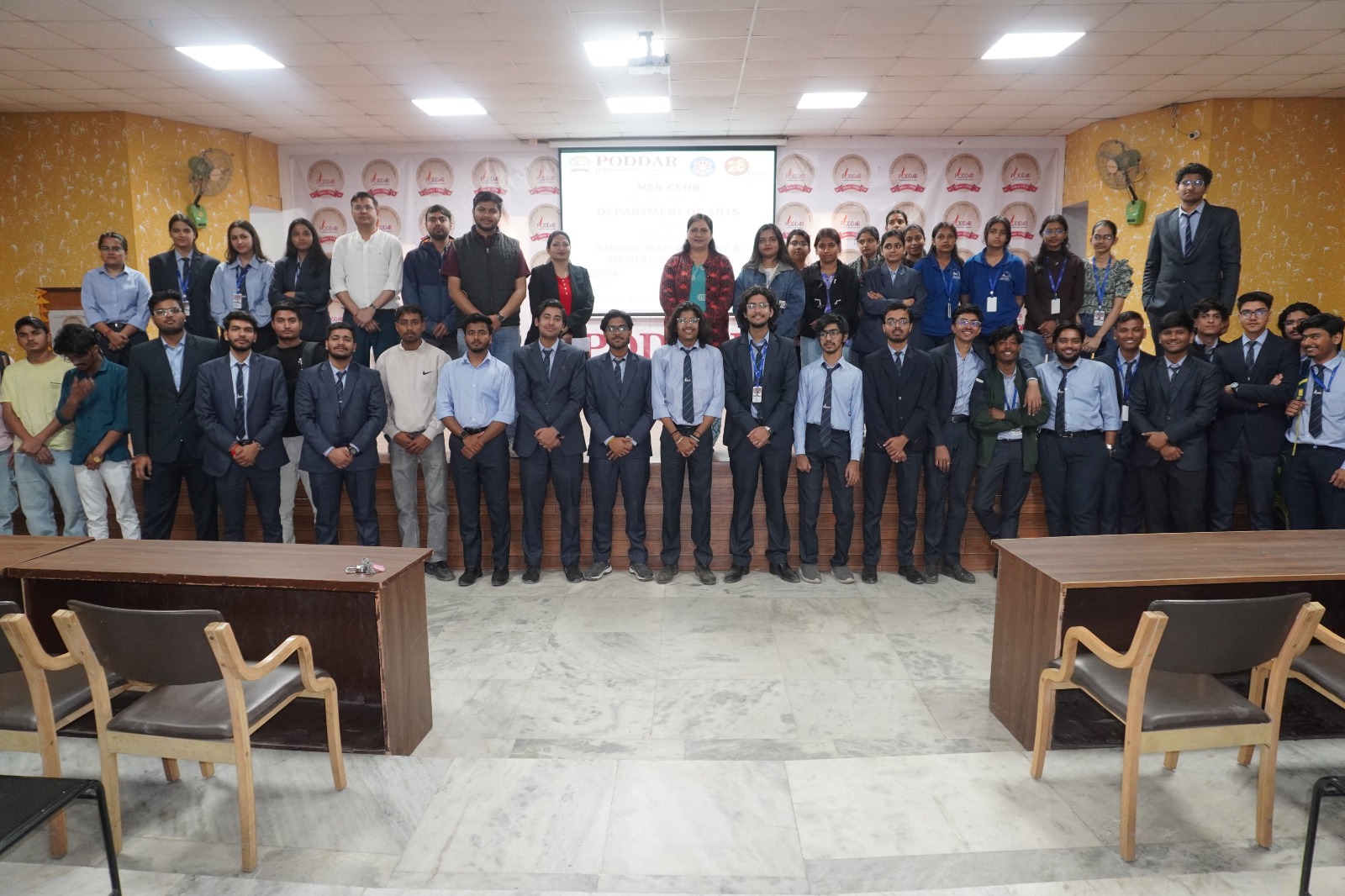 The NSS Club in association with the Department of Arts organized a session on Stress Management and Mental Well-being at Poddar International College, Jaipur. The programme was conducted under the guidance of NSS Programme Officer Dr. Shilpika Tewari . Dr. Tewari informed the students that this session was one of the programmes organized as part of the 28 years celebration of the Poddar Group of Institutions .
