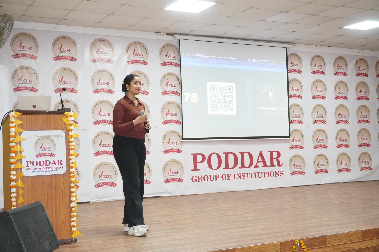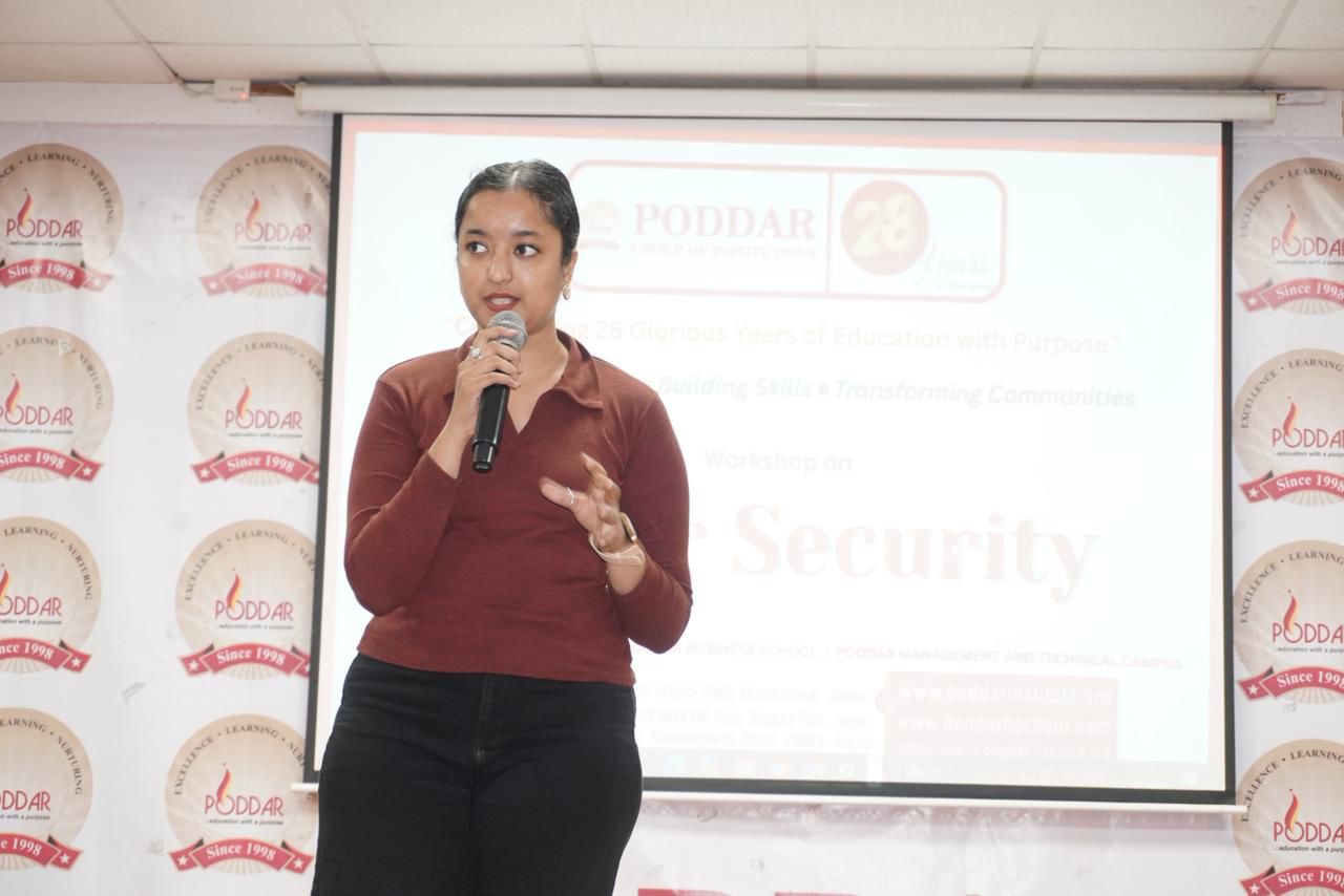 The Department of Computer Applications of Poddar Group of Institutions in celebration of its 28 Years of Excellence organized a workshop on Cybersecurity on 13 February 2026 for the students of the department. The session was conducted by Mr. Niranjan Dadhich, Security Consultant and Founder, Threat Expert Cyber Solutions Pvt. Ltd., and Ms. Radhika Agarwal, Security Analyst.