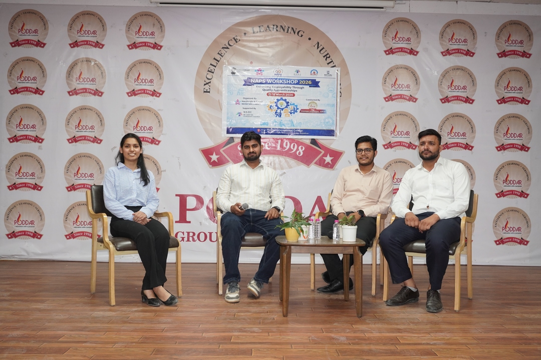 A panel discussion on “Strengthening Quality Apprenticeship Ecosystem” was effectively moderated by Mrs. Anuradha Ghosh, Training and Placement Officer at Poddar International College. Panelists included Mr. Raj Kumar from GENUS Engineering Company, Mr. Rajeev Kumar from the National Skill Development Corporation, Ms. Preeti Kashyap from the Handicrafts and Carpet Sector Skill Council, Mr. Arvind Kumar from Poddar Trust, and Mr. Neeraj Gupta, Zonal Head at HDFC Bank. The discussion focused on bridging the industry skill gap and promoting quality apprenticeships.