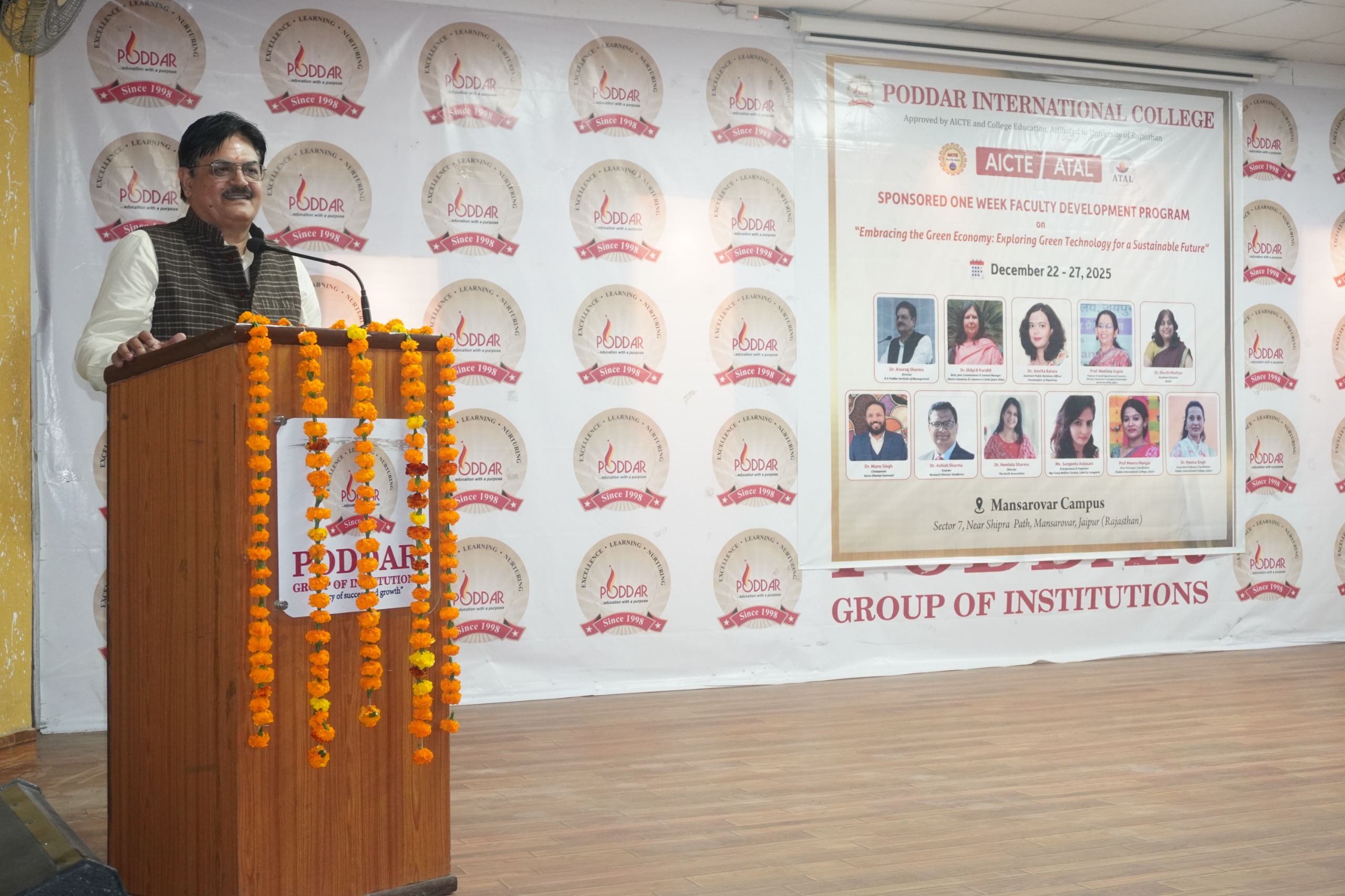 The first day of the AICTE–ATAL Basic Faculty Development Programme (FDP) on “Embracing the Green Economy: Exploring Green Technology for a Sustainable Future” was successfully conducted on 22nd December 2025 at Poddar International College. The programme was inaugurated with the objective of sensitizing faculty members towards sustainability, green technologies, and environmentally responsible development.