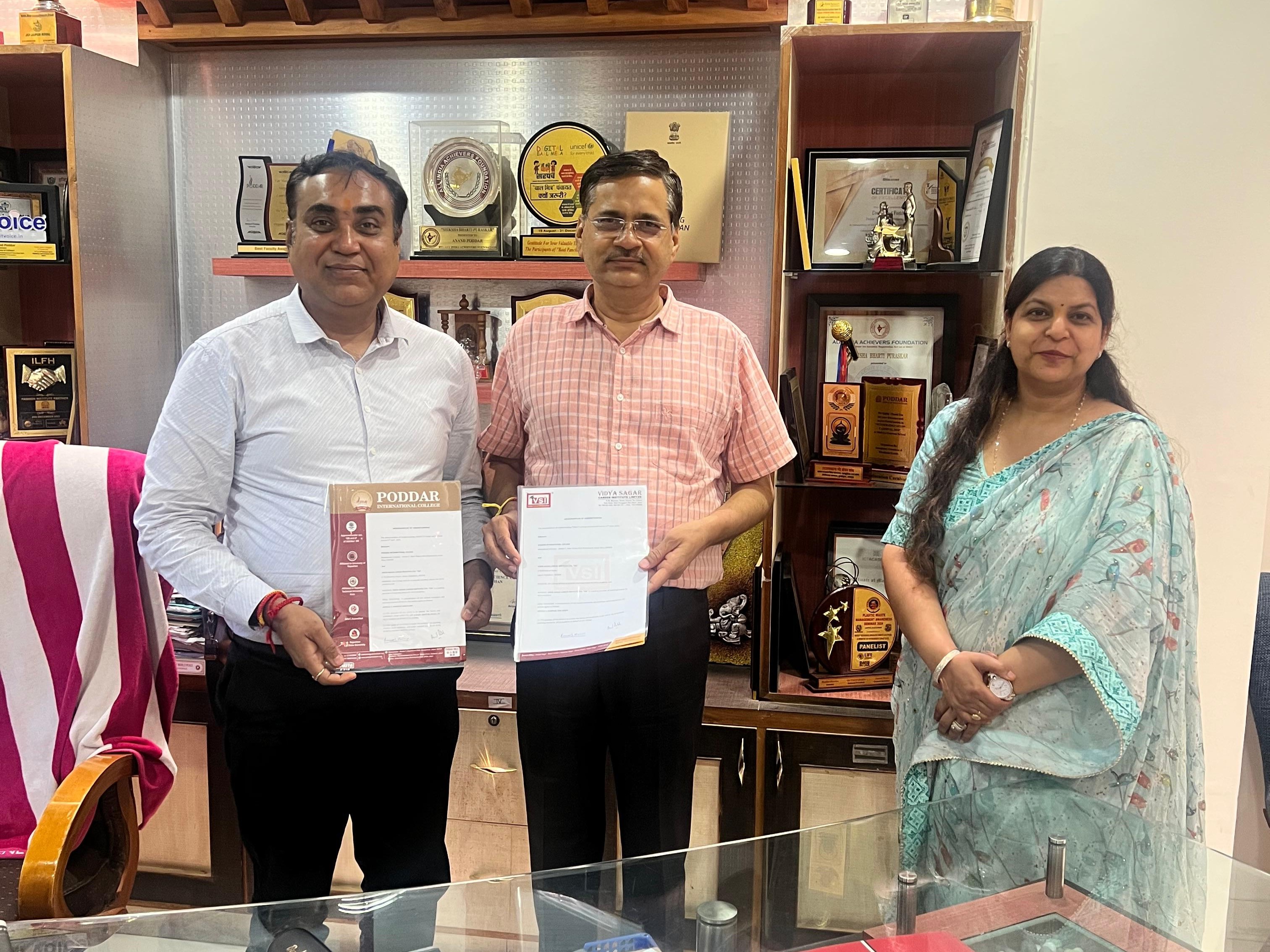 Poddar Institute has recently signed a Memorandum of Understanding (MoU) with Vidya Sagar Institute (VSI), Jaipur, a leading name in CA and commerce education in India. This partnership aims to provide students with better academic exposure, industry insights, and practical knowledge.
