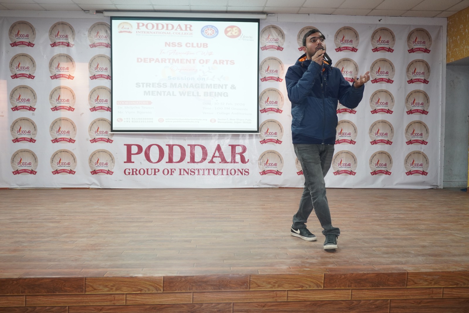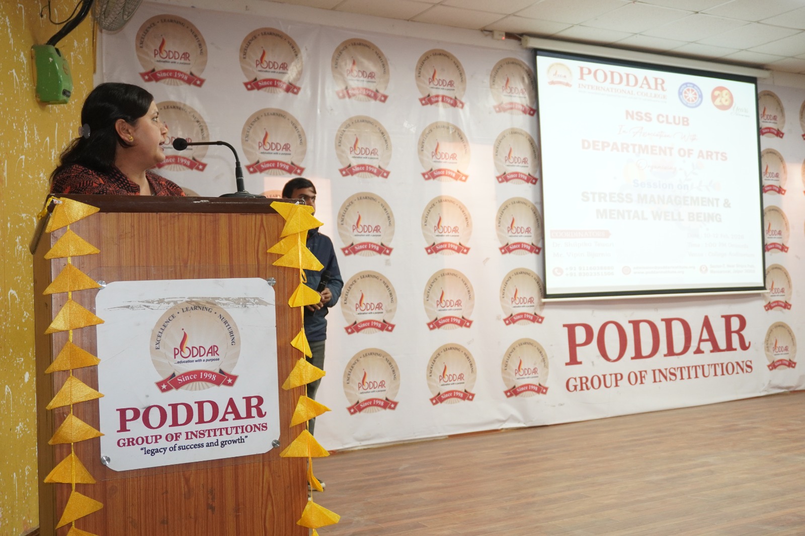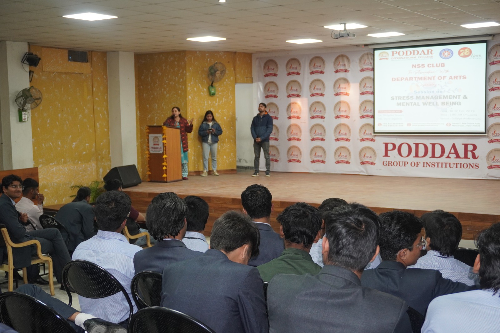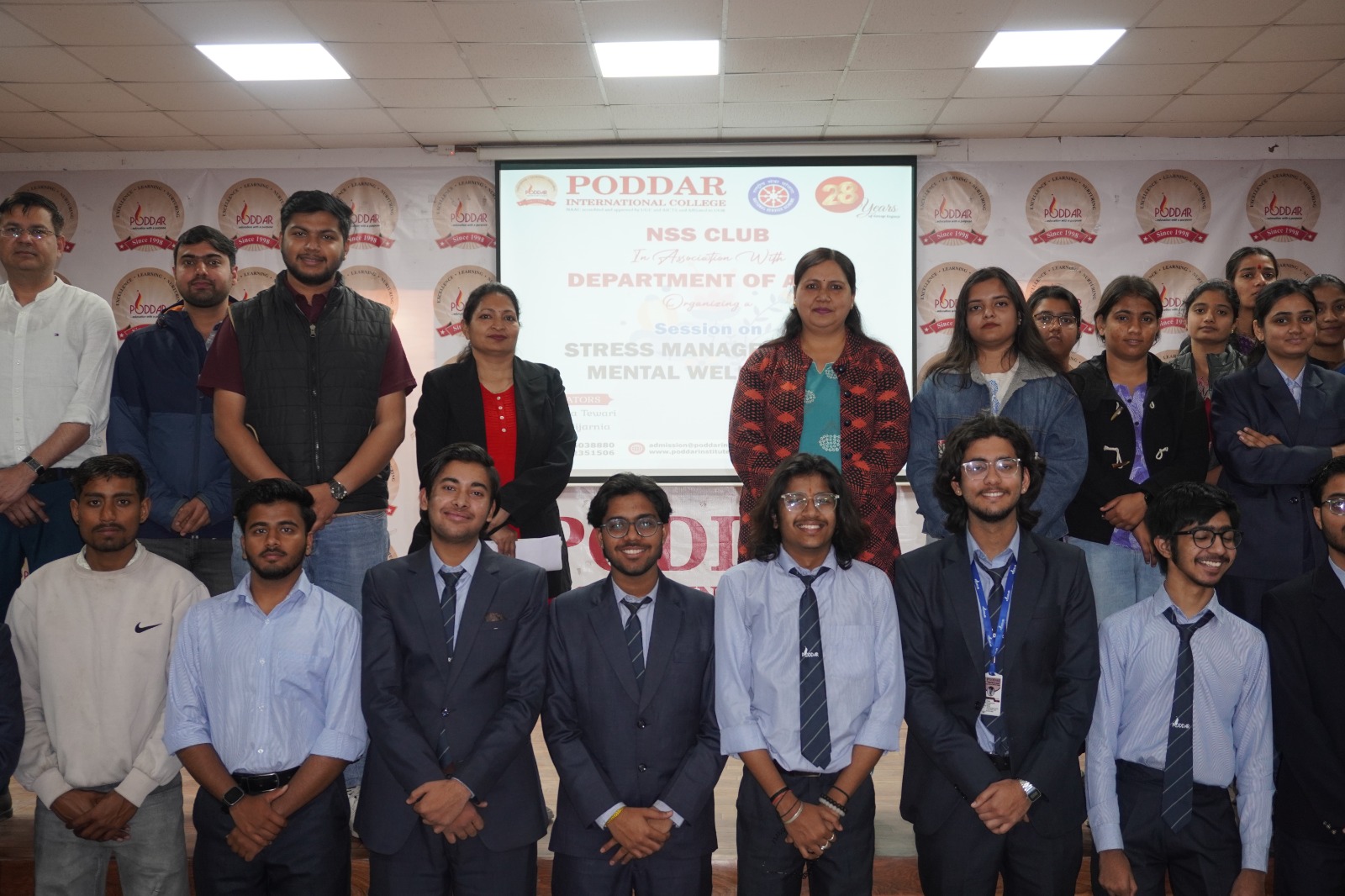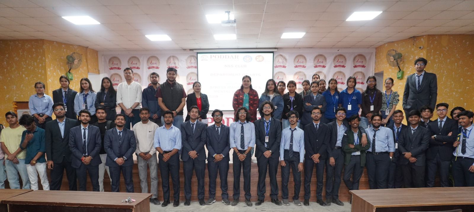 The NSS Club in association with the Department of Arts organized a session on Stress Management and Mental Well-being at Poddar International College, Jaipur. The programme was conducted under the guidance of NSS Programme Officer Dr. Shilpika Tewari . Dr. Tewari informed the students that this session was one of the programmes organized as part of the 28 years celebration of the Poddar Group of Institutions .